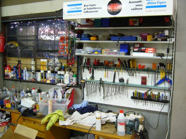 Joka ukolla on tietysti oma arsenaalinsa erilaista yleiskalua, avainta, ruuvia, mutteria yms. härpäkettä, mutta raskaampaa tarviketta löytyy sitäkin, joko yksityistä tai kimpassa ostettua.