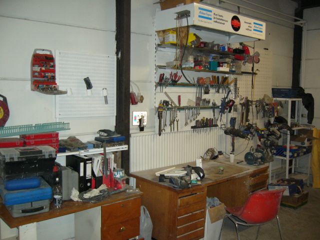 Laitteistossa ei niin suurta hurraamista tässä vaiheessa ole, käsityökalua löytyy kultakin kohtuullinen määrä, raskaammalla puolella käytössä on kompressori ja hitsikone. Kuvat aukeavat klikkaamalla isompaan kokoon.