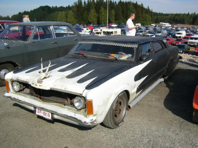 This Taunus photographed in the Forssa Pick-Nick had had it's share of serious tuning with quite open-minded attitude... Even a Continental -kit was included in the armament. Tubing on the rocker panel area is not an exhaust; it's function was obviously more or less to prevent the chassis from folding :-) Piece of the same material was installed vertically between front seats, apparently it was a part of supportive structure too... Very much Rock'n'Roll -spirited apparatus