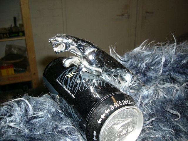 New generation figurehead. The feline can normally be found atop of a Jaguar's hood, now it is sitting on an Olds, in between some fur from ancient hobby car project and a can of not-so-masculine alcoholic beverage...