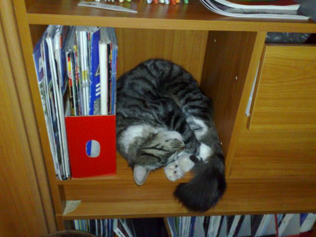 Yksi tapa käyttää kirjahyllyä.... Tai kissaa...