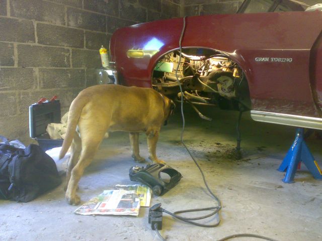 Technical advisor Elvis, the only dog capable of repairing Torinos in Finland critically inspecting Aku's work...
