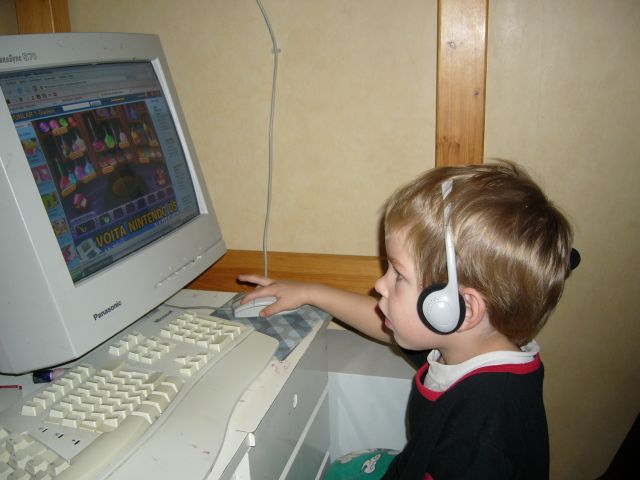 Perheaiheisia kuvia lisää, kameraan ei ollut oikein muuta tarttunut. Tässä perheen nuorin kesyttää kompuutteria. Pelaaminen sujuu jo yllättävänkin näppärästi.