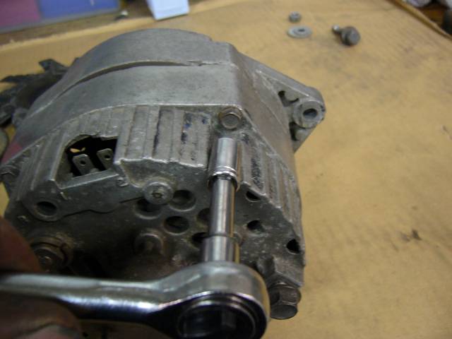 Ensimmäisenä laturi kannattaa kiinnittää tukevasti penkkiin siivapyörän ja tuuletinrattaan irrottamiseksi. Akselin päähän tarjotaan sopivaa kuusikulma-avainta ja siitä vastaan pitäen avataan akselila oleva mutteri, jolloin siivapyörä ja tuuletinratas lähtevätkin irti. Ei tosin välttämättä helposti...