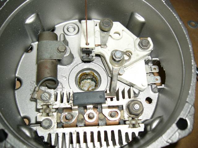 Sen jälkeen onkin vuorossa hiilisilta/lataussäädin -yhdistelmä. Muoviosat koostuvat kahdesta osasta, joita pultit pitävät paikallaan. Huomaa, että pulttien alla on eristerenkaita tietyissä paikoissa, joten ennen osien irroittamista kirjaa tarkkaan ylös, mikä kuuluu minnekin. Huomaa kuvasta myös langanpätkä, jolla hiilet on lukittu pesäänsä. Jos hiilet ovat irrallaan alle 10 milliset, uusi ne. Kuvassa näkyvä musta kolmoisdiodi kannattaa myös mitata. Mittarin musta johto vastusmittausasennossa säätimen puoleiseen liittimeen ja mitataan vuorotellen kustakin kolmesta navasta. Sen jälkeen käännetään mittarin johdot. Virta saa kulkea vain toiseen suuntaan.